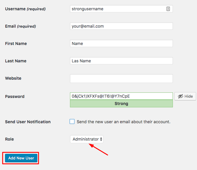 Đừng sử dụng admin làm WordPress administrator username nhé, tất cả mọi người đều biết admin là tên mặc định rồi! Nếu đang dùng tức là bạn đang giúp hacker một tay để vào được trang quản trị dễ dàng. Việc đổi thông tin quản trị, tên đăng nhập sang một tên khác thay vì là admin là rất quan trọng(xem hướng dẫn này – tiếng Anh nếu bạn không biết làm) hoặc tạo một tài khoản Administrator mới và xóa cái cũ. Làm các bước sau nếu bạn chọn cách sau::